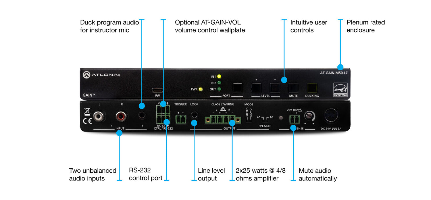 The Atlona AT-GAIN-M50-LZ is a two-input mixer amplifier designed for low impedance education and commercial applications. The amplifier features two unbalanced stereo audio inputs with independent level control and delivers either two channels of 25 watts each into 4 or 8 ohms, or a single channel of 50 watts.