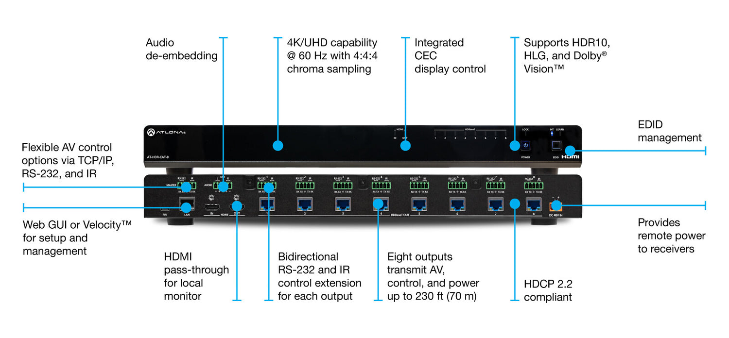 Features and capabilities designed to ease integration in commercial AV distribution applications include HDMI signal pass-through, audio de-embedding, EDID management, CEC display control, RS-232 and IR control extension, remote power for receivers, and HDBaseT link testing.