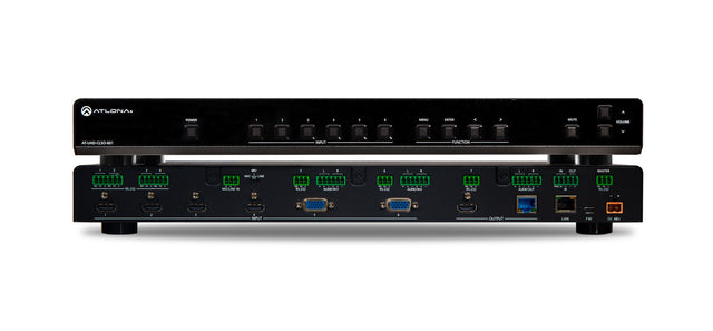 The Atlona AT-UHD-CLSO-601 is an advanced six-input, multi-format switcher with built-in 4K scaling and mirrored HDBaseT and HDMI outputs. It simplifies classroom and small office system integration by providing four HDMI and two multi-function analog inputs. The CLSO-601 is designed to be the central component of an automated AV system. Automatic display control powers the display automatically whenever a source is connected or disconnected. Automatic input selection on the CLSO-601 works by sensing the presence of any video signal.