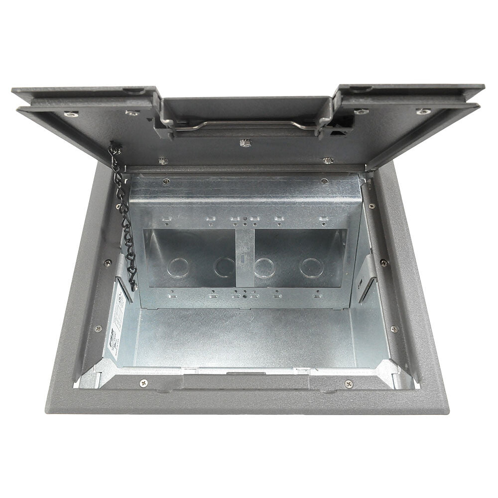 The RFL-AV floor boxes are perfect for applications with raised floors that require AV and power in one box. AV connections require additional space behind the connector plate to accommodate interfaces, connectors and large cable radii. These boxes handle that and more! The “Q” model is the larger version and accepts standard single gang, 2-gang and 3- gang plates. A 4-gang bracket (with 3 dividers) is available for applications requiring a four gang plate. Covers and carpet trims are available in gray, black and clay. If your application requires a custom color, FSR will be happy to quote on your specific requirements. You have a choice of covers with the RFL-AV Series. If you are using carpeting, select the dual door or single door covers. If you have a floor where you don’t want to insert the carpet on the top of the box, select the solid cover door. (Note: the RFL-DAV is only available in the single door for carpet, or the solid cover door.) The back boxes are available in 4.5” depth, and are constructed of 14-gauge steel.