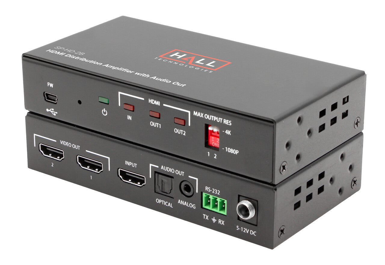 The SP-HD-2B is a compact 2-port HDMI 2.0 splitter that can produce two identical outputs from a single HDMI or DVI source for display on two displays. It supports PC and HD resolutions from 480p up to UHD - 4K @60Hz 4:4:4. It is HDCP 2.2 compliant, and supports deep color, 3D, and HDMI audio formats including LPCM 7.1, Dolby TrueHD, and DTS-HD Master Audio. Each HDMI output can be independently downscaled from 4K to 1080p if needed.