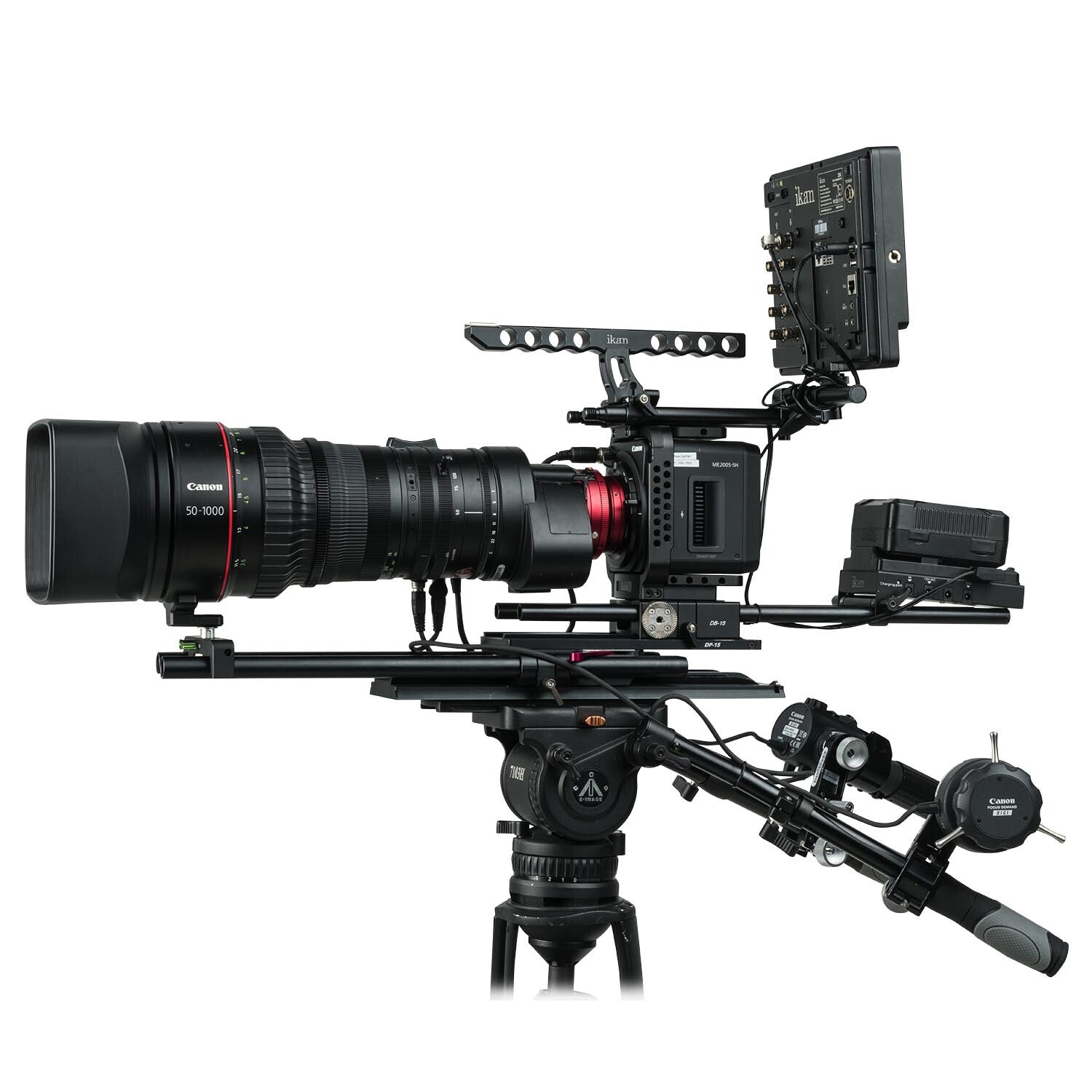 The ELE-ME200-RIG is a complete cage kit designed for the Canon ME200. Often used in conjunction with large lenses and in low-light environments, the ME200 is compatible with many accessories, and the ELE-ME200-RIG gives you a place to mount those accessories while adding security and stability to the entire system. Monitors and small lights can be mounted to the ELE-ROSEARM or to the cold shoe mount located on the top handle. The bottom rods extend far enough to mount a lens support bracket for long lenses, and the top and bottom rods can both support manual and powered follow focuses. The ELE-DOVETAIL-9 base plate securely seats the cage body and gives the operator the ability to better balance their load while offering safety measures to assure the camera and rig do not slide loose.