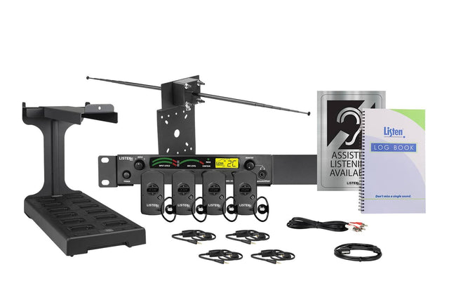 The LS-71 216 MHz Stationary RF System from Listen Technologies is the perfect high-capacity assistive listening solution for permanent installations. Offering coverage up to 914.4 m (3,000 ft.) for venues handling as many as 100 visitors or clients, the complete package includes our LT-800-216 Stationary RF transmitter and four of our high-performance LR-5200-216 iDSP receivers, as well as everything required for immediate assistive listening. The LS-71 system comes with our LA-381 Intelligent 12-unit charging tray, which provides plenty of capacity for charging, storing, and managing up to twelve (12) receivers. The high-capacity tray allows room for upgrading and expanding your RF system as the demands of your venue grow. An assistive listening notification signage kit, cable management unit, log book, and more are also included to create a convenient and complete solution for offering assistive listening immediately.
