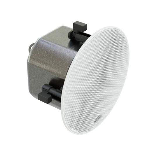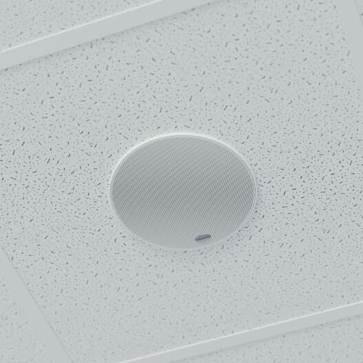 The amplified flush-mounting speaker can be installed in a ceiling or wall up to 1-3/8 inches thick and comes with a lightweight ceiling tile brace. The air-sealed steel enclosure features a recessed cable cavity and an RJ-45 connection. The magnetically attached white metal grille gives a streamlined appearance while providing easy access to the swivel-out mounting tabs.