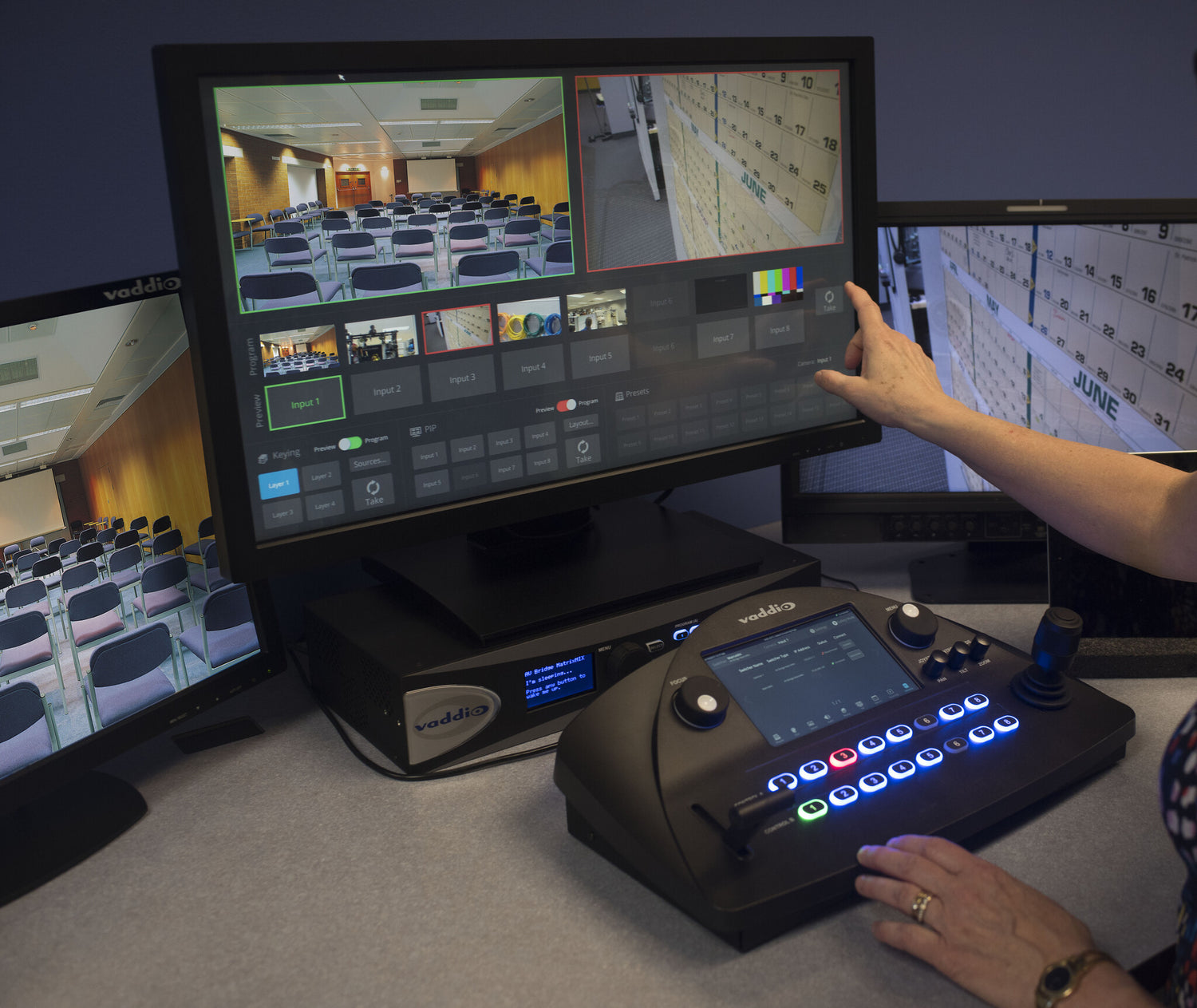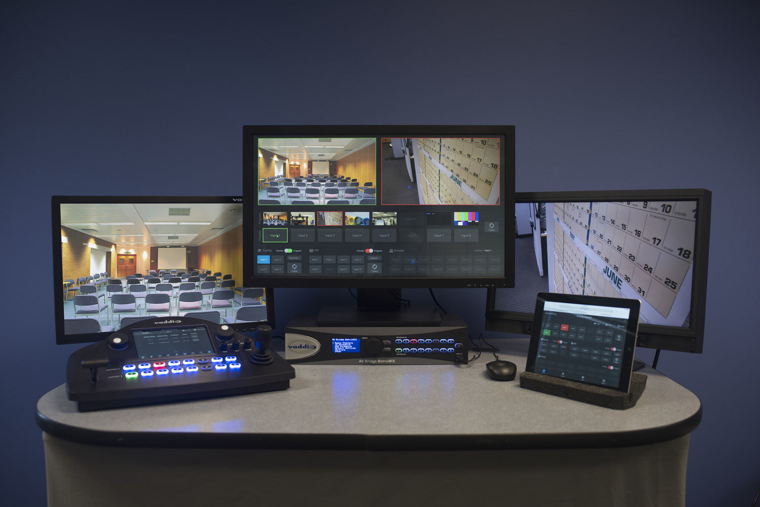 The screen's capacitive touch creates an interactive surface for the AV Bridge MatrixMIX's multiview output - for simple preset recall, video switching and graphics keying. Built-in speakers allow the operator to have a customizable audio mix from the switcher.