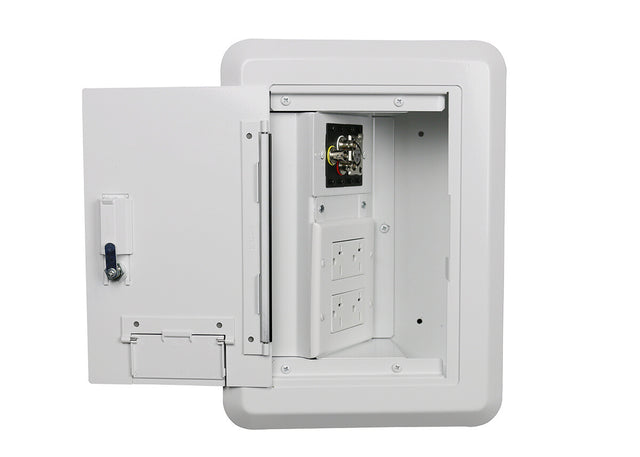 • Cover opens a full 180° and can be painted to blend with room decor. Includes integrated handle, lock and key set for security, and flush egress door for cabling