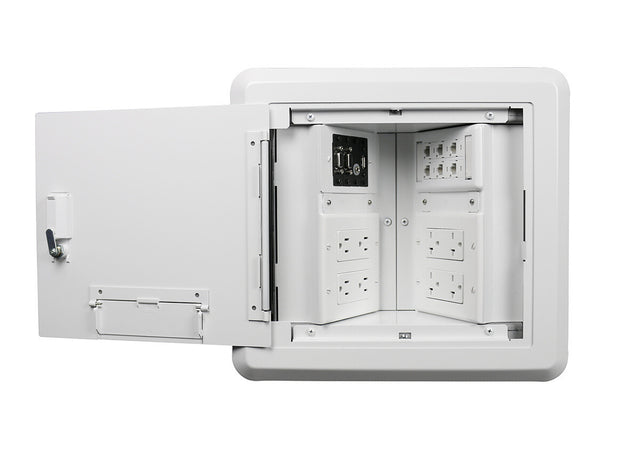 - Cover opens a full 180° and can be painted to blend with room decor. Includes integrated handle, lock and key set for security, and flush egress door for cabling