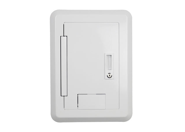 Decorative wall box cover designed to fit onto the 4-gang hinged wall box (EHWB4). Cover comes complete with a hinge that allows the cover to open a full 180 degrees, an integrated handle with lock and key set, and an egress door that allows the cables to exit the box flush against the wall. The cover is offered in two powder-coated finishes white: EHWBC4-WH or black EHWBC4-BK.