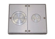 Flangless cover for use in tile or carpet installation. Die-cast aluminum assembly. Provided with one 1'' trade size screw plug for power or communication type cabling and one combination 1 1/4'' and 2'' trade size screw plug for communication type cabling. Allows for feeding both power and communication cabling. NOTE: Add suffix TR to the end of the part number to indicate tamper-resistant cover assembly. Tamper-resistant versions are secured with a single tamper-resistant screw.