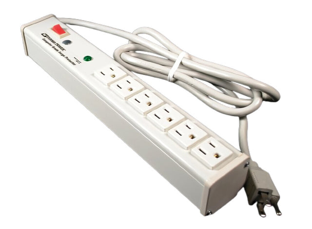 Perma Power computer grade surge protection. Six outlets, lighted switch, durable putty white aluminum housing, 15A. 15' (4.6m) 14/3 SJT putty white cord with NEMA5-15 plug. Length 16"" (407mm). Snap-on, slide-off mounting.