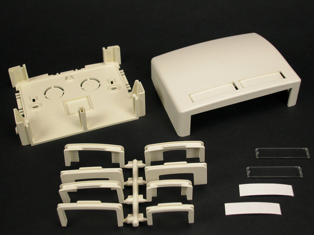 Surface mount box for use with Eclipse Raceway or standalone application. Has two 1/2'' trade size KOs. Accepts two front-loaded downward facing Ortronics Series II inserts.
