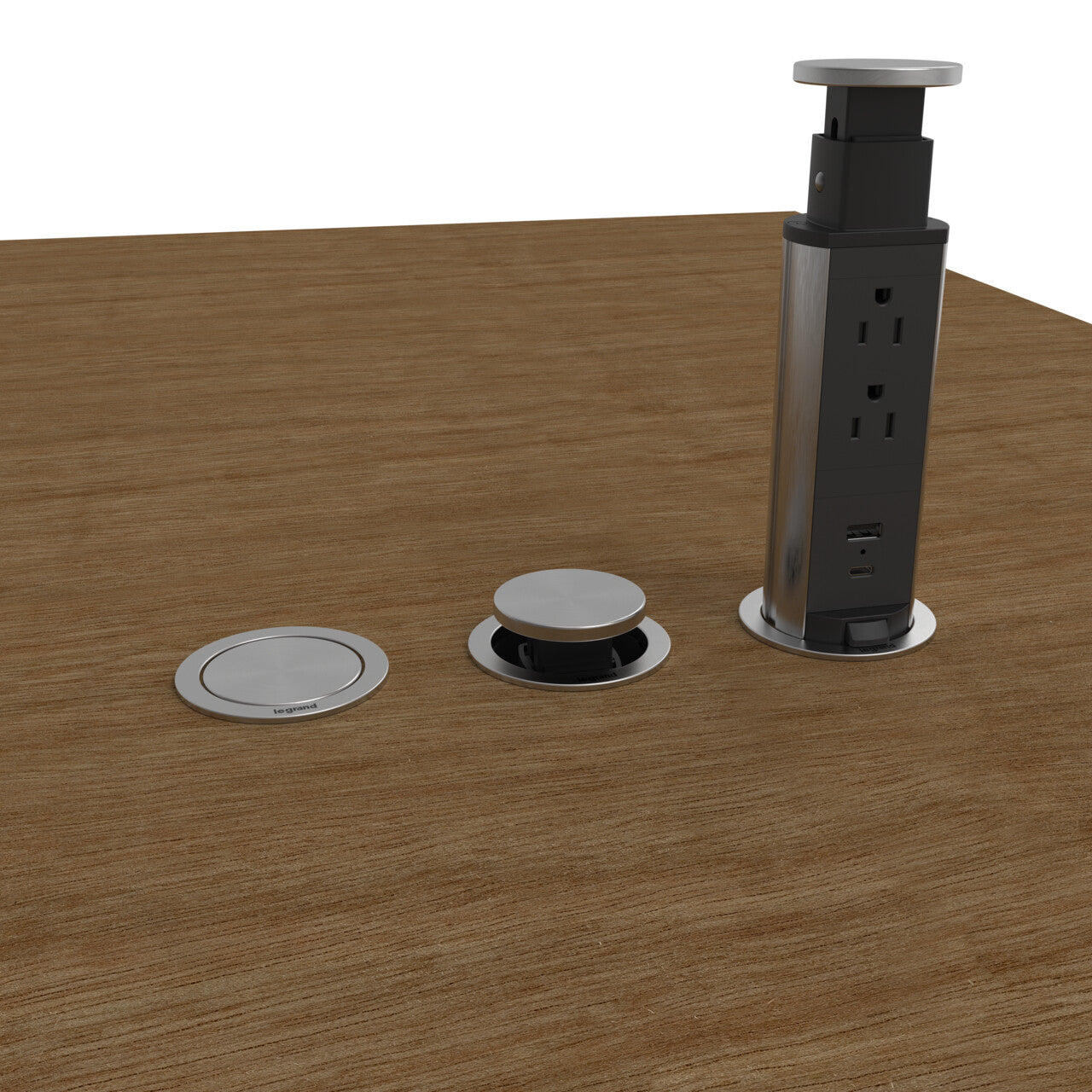 The Pop Up Tower allows for convenient access to power and charging while remaining hidden when not in use. The top cap of the tower pops up when pushed in and can be pulled up and locked in the open position, revealing two tamper-resistant outlets, a USB-A port and USB-C port. The USB ports share a combined total output of up to 15W for charging of small electronic devices. When finished with charging, the pop up tower can be pushed back down into the surface once the lock is released at the base of the unit.