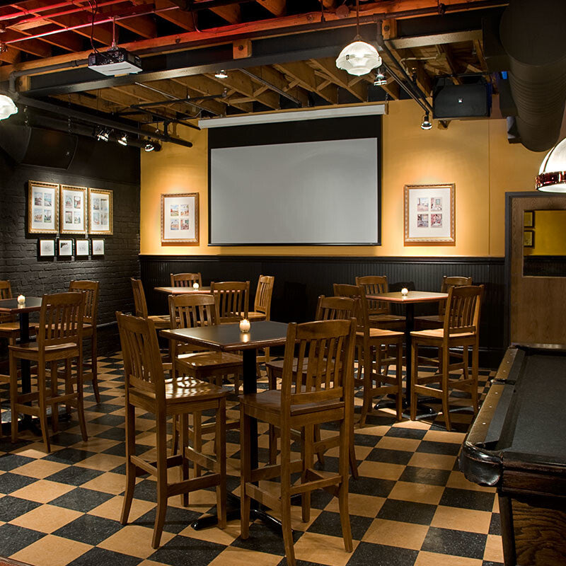 The popular and affordable Targa works well in conference and lecture halls, hospitals, hotels, restaurants, boardrooms, or church applications. A pentagonal steel case houses the projection screen. Matching endcaps form universal mounting brackets for easy wall- or ceiling-mounting. Motor is mounted inside the roller providing a clean, low-profile appearance for this electric projection screen. This free-hanging screens maintain flatness due to the weight of the viewing surface and bottom dowel.